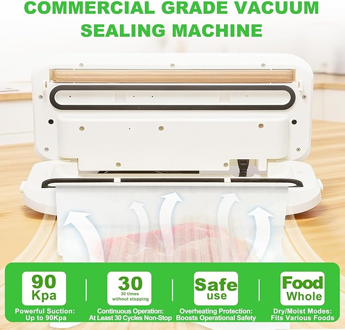 - 【Stable Performance】- Equipped with dual-indentation heat sealing technology, 90kPa vacuum suction power, and a 180W motor, it supports 30 consecutive vacuum sealing cycles without pausing to meet daily multi-tasking needs. This outperforms standard household food vacuum sealers that require stopping for cooling after just 5-10 cycles.