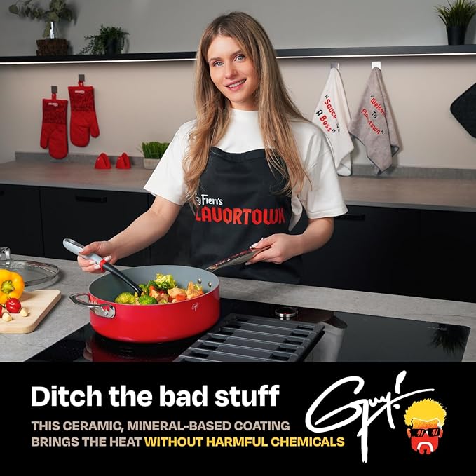 Guy Fieri's Flavortown 11-Piece Ceramic Cookware Set, Nonstick Pots and Pans for Cooking, Made without PFAS PTFE PFOA, Oven Safe, Dishwasher Safe, Easy to Clean Everyday Cookware