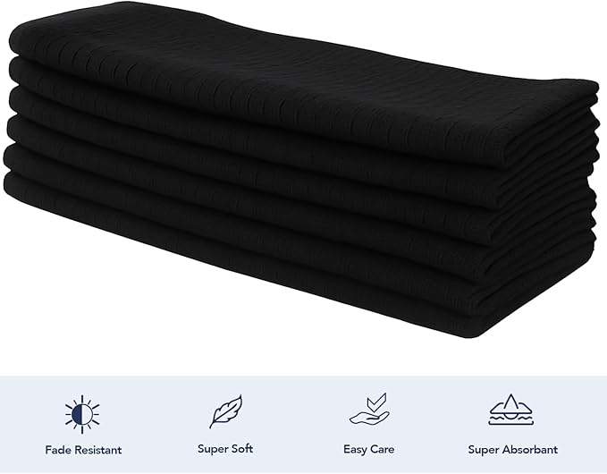 - FUNCTION MEETS STYLE: Our thick 100% Ring Spun Cotton Kitchen towel will leave your dish dry with just a few swipes. This kitchen towel set has a total of six striped solid black windowpane design dish towels each of size (15x26 inches). They come with a loop to hang for easy storage.