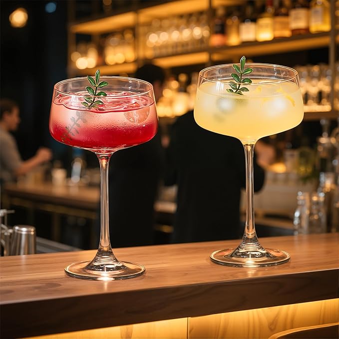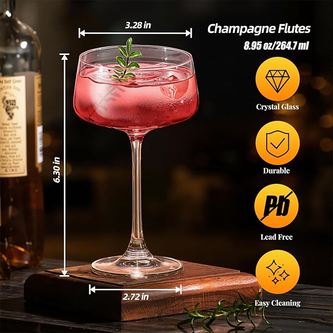 - 【Refined Details】The flat base and broad opening ensure stability, making these glasses ideal for constructing champagne towers. The classic coupe shape exudes vintage elegance while beautifully showcasing layered cocktails, garnishes, or foam. The stem minimizes hand contact, preventing heat transfer for optimal temperature retention. Ergonomically designed, the stem provides a secure and comfortable grip, while the weighted base prevents tipping for worry-free enjoyment of champagne, wine, and cocktails.