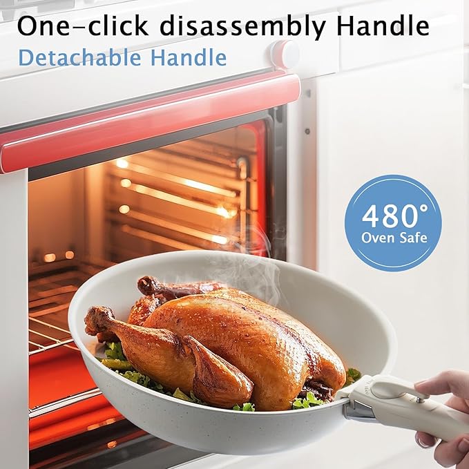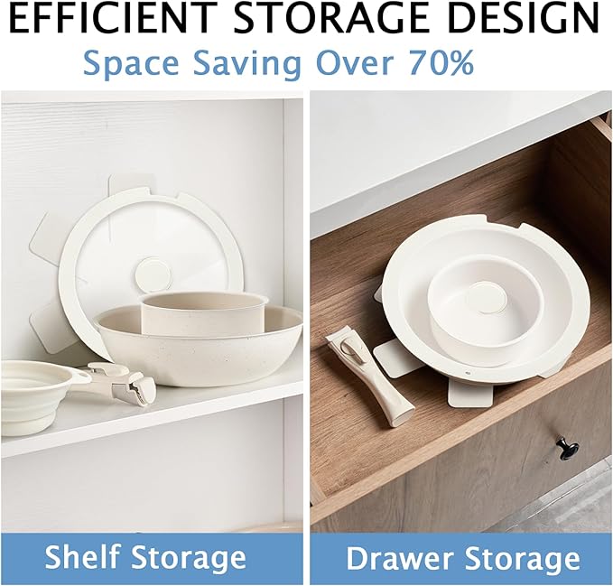 - Ultimate Space-saving Solution: Experience the ultimate space-saving solution with our cookware set featuring a detachable handle. Stack and organize your kitchen pots and pans set easily under cabinets, saving up to 70% more space compared to traditional sets—perfect for kitchens of all sizes