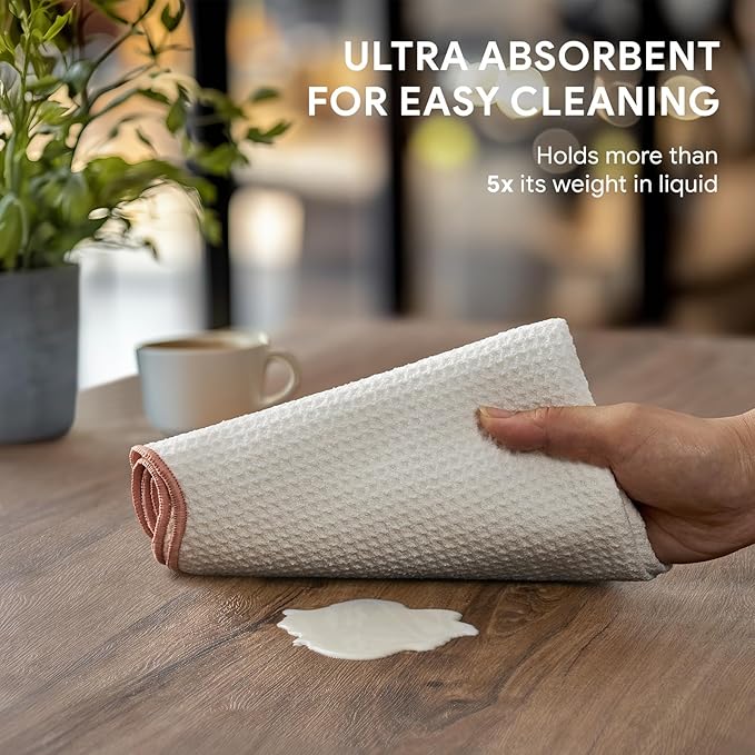 - [ Next-level Absorbency ] - These absorbent kitchen towels are made with high quality microfiber fabric and can hold more than 5x their weight in liquid, making drying dishes and cleaning up kitchen a breeze.