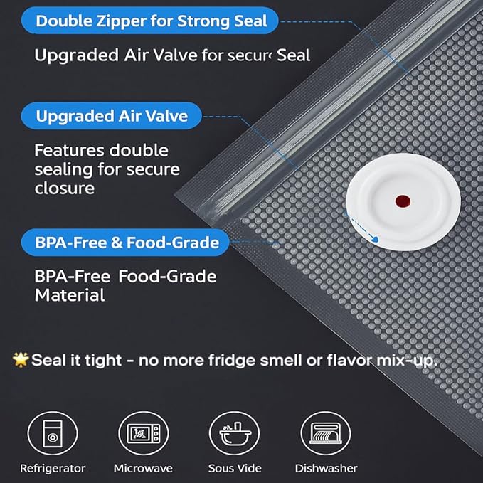 - DOUBLE ZIPPER DESIGN: Features a secure double zipper closure system with an air valve for effective vacuum sealing and airtight food storage
