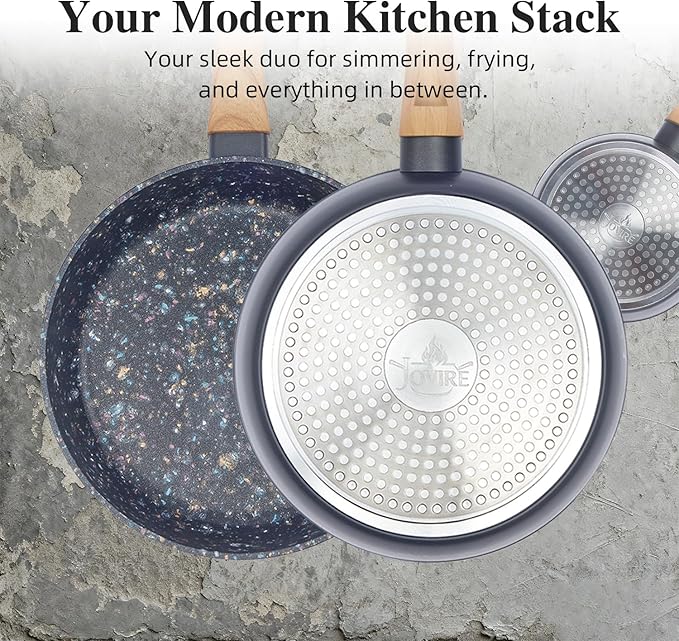 - 【The Perfect Pan for Eggs & The Ideal Pot for Sauces】 This set is designed for real-world cooking. The 8.5-inch frying pan is your ultimate egg pan, ensuring flawless omelets and pancakes. The 1.43QT saucepan with lid is ideal for simmering sauces, boiling oatmeal, or heating soups—covering all your daily essentials.