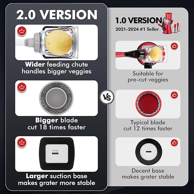 - Fully Upgraded Design : Compared to previous models, this premium cheese grater is fully optimized. The inlet and outlet are 30% wider, making it easier to handle most uncut vegetables, thus increasing productivity. The blades are bigger and sharper, cutting 18 times faster than conventional cheese shredders and delivering 50% more ingredients per rotation for greater efficiency. The reinforced suction cups are larger and more stable in use. This grater is easier and more efficient to use, saving you up to half the time on food prep.