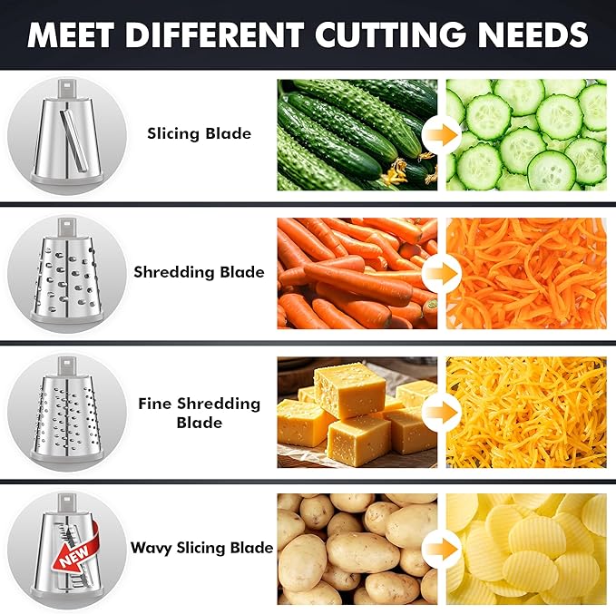 - Multi-Blade Wavy Rotary Grater : This upgraded vegetable grater now includes a new wavy slicing blade in addition to the original three blades, helping you create perfectly wavy slices for more of your needs. Equipped with four interchangeable 430 stainless steel blades, this cheese grater hand crank also includes a slicing blade, a shredding blade, and a fine shredding blade in addition to the wavy slicing blade. The rotary cheese grater is ideal for grating cheese, radish, nuts, potato, carrot, cucumber, zucchini and more.
