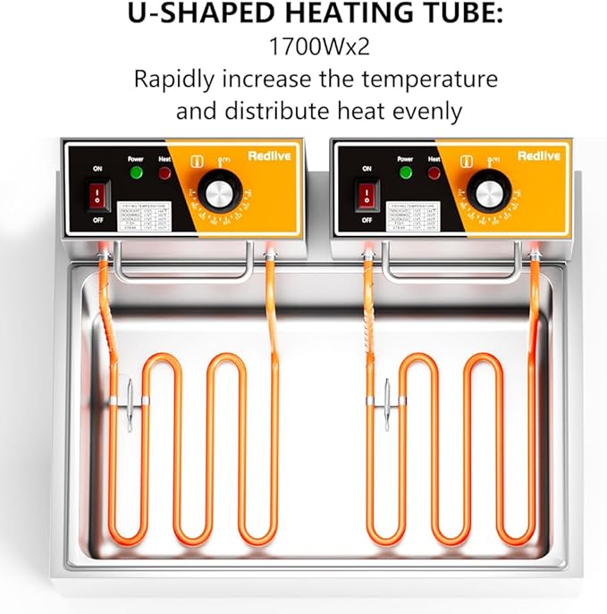 - 【Electric Deep Fryer】Equipped with 1700W×2 U-Shaped heating tubes, 10.7 QT×2 Oil Tank、11.16QT Large Basket and 6.35 QT×2 Baskets. The temperature can be controlled within the range of 140°F (60°C) - 390°F (200°C;