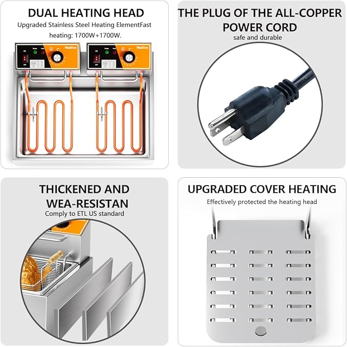 - 【High Quality - Safe and Durable】The machine is made of high-quality 0.6mm thick stainless steel, and the Oil Tank with a handle is made of 0.8mm thick stainless steel. The upgraded 304 stainless steel heating tubes heat up quickly, enabling perfect frying results. The full-coverage slag isolation board can effectively block food residues from contacting the heating tubes, ensuring the stable operation of the heating tubes and significantly extending their service life. The certified full-copper power cord ensures safe use and long durability;