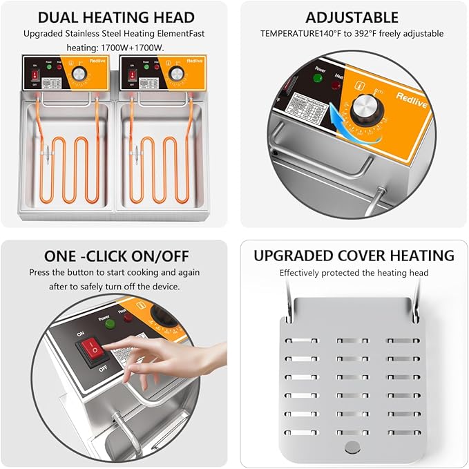 - 【Electric Deep Fryer】Equipped with 1700W×2 U-Shaped heating tubes, 10.7 QT×2 Oil Tank and 6.35 QT×2 Baskets. The temperature can be controlled within the range of 140°F (60°C) - 390°F (200°C).