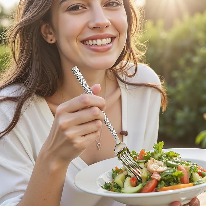 - Elegant Hammered Design: The hammered silverware set finish and trapezoid handles of flatware set for 6 not only offer a comfortable grip but also exude sophistication. Meticulously polished, it adds a touch of luxury to any table setting