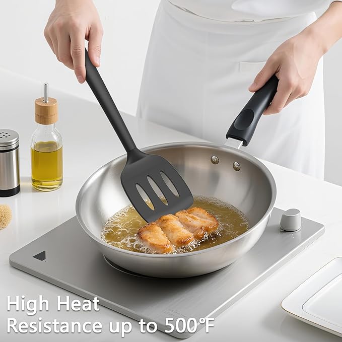 - [Versatile Spatula Set of 3]: This cooking utensils set includes a Large Fish Spatula, Slotted Spatula, and Solid Spatula—ideal for flipping eggs, pancakes, burgers, and frying fish without scratching your kitchenware