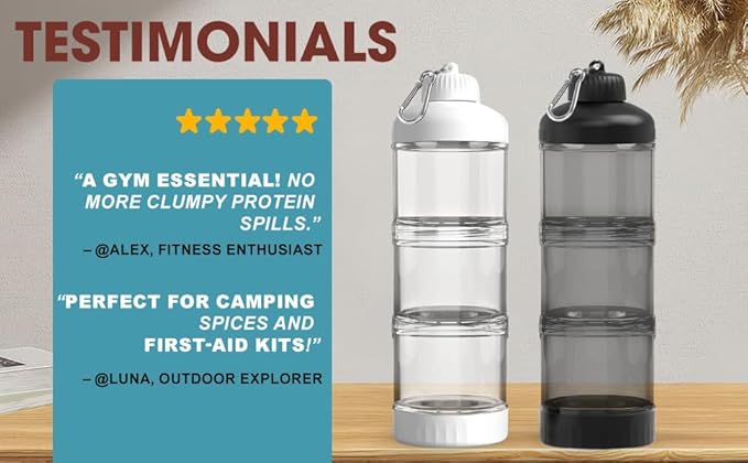 - Multipurpose Use and Convenient Design: more than just a protein powder dispenser, this versatile protein powder holder can be applied for a variety of powder types, not solely limited to dietary supplements; The integrated funnels on the lid enable you to pour out the powder smoothly and easily into any other container, reducing spills and wastage; The hiking buckle makes it easy to carry your container on your backpack; the individual bottom containers makes it easy to put pills or other small items.