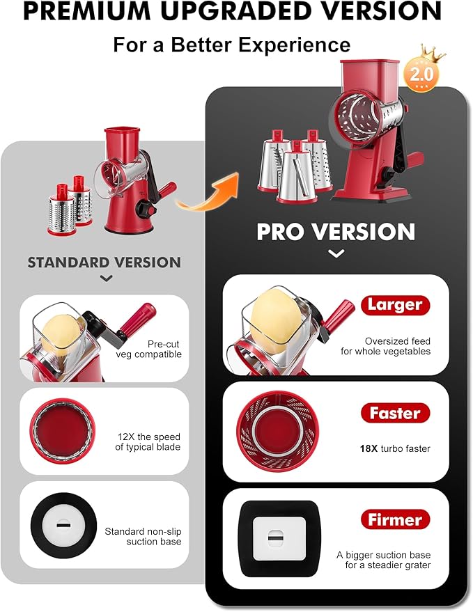 - Reinforced Base & Wider Tube: The upgraded rotary cheese grater boasts a larger, thicker, and more stable non-slip suction base. And the vegetable shredder's 30% wider feeding tube and outlet easily accommodate large, uncut vegetables. Let whole carrots or potatoes go directly in