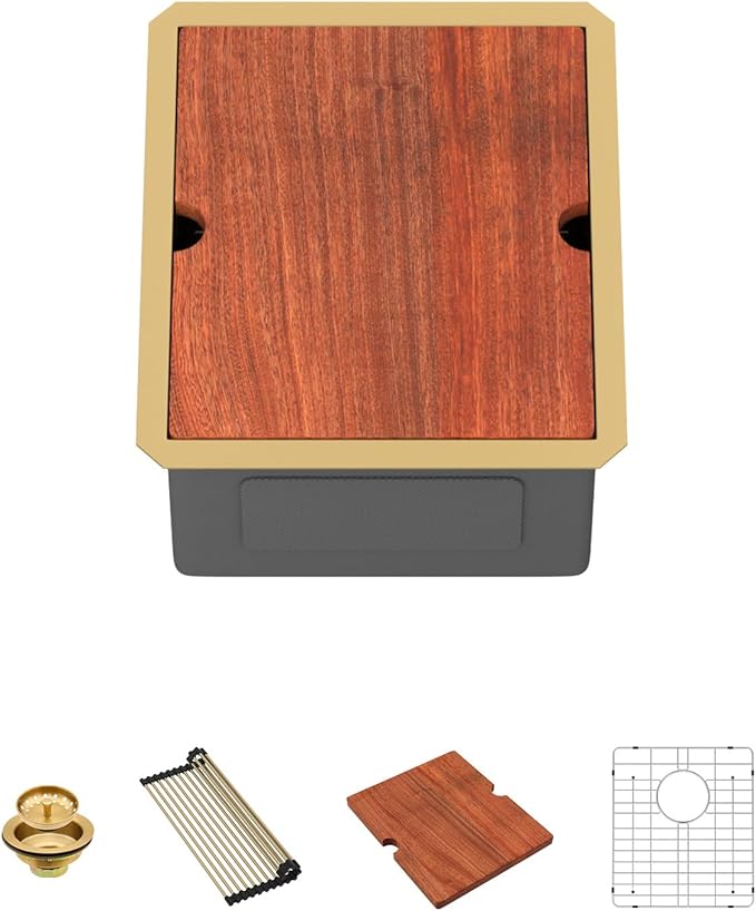 - Perfect Size and Comprehensive Package: Measuring 15'' x 18" x 10’’, this sink fits into a minimum cabinet base of 18 inches. The 3.5-inch standard draining opening is compatible with most garbage disposal units. The package includes a stainless workstation bar prep undermount sink, bottom protective grid, wood cutting board, drain assembly, roll-up rack, cut-out template, and installation instructions—everything you need for a seamless installation and use.