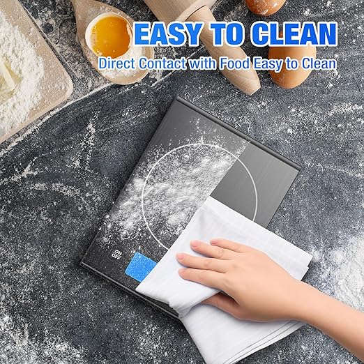 - 【High Quality Material, Easy to Clean】The kitchen scale is made of 304 food grade stainless steel, just wipe the surface to keep it clean. Set includes 1*Digital Kitchen Scale, 1*USB Cable, 2*AAA Batteries, 1*Manual. Please place the scale on a clean, level surface when in use