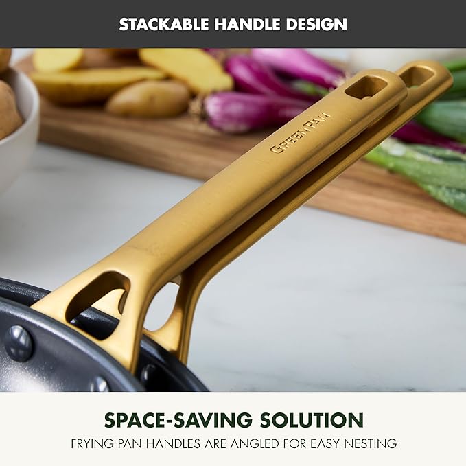 - STACKABLE HANDLE DESIGN: Frying pan handles are angled for easy nesting