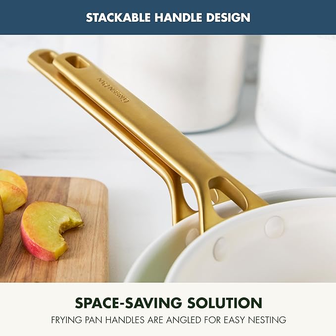 - STAINLESS STEEL GOLD-TONE HANDLES: Riveted matte-finished handles offer a safe and secure grip while adding a pop of design to any kitchen.