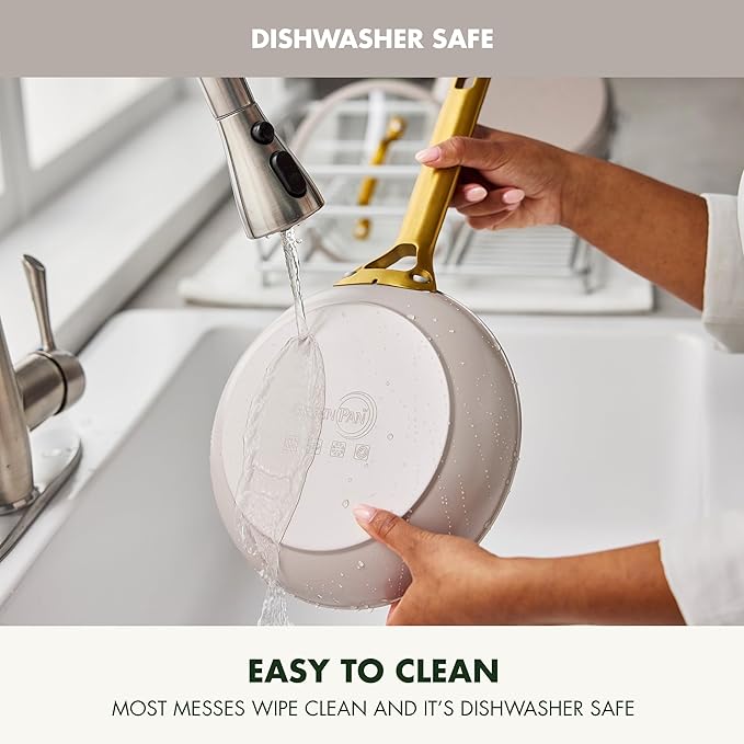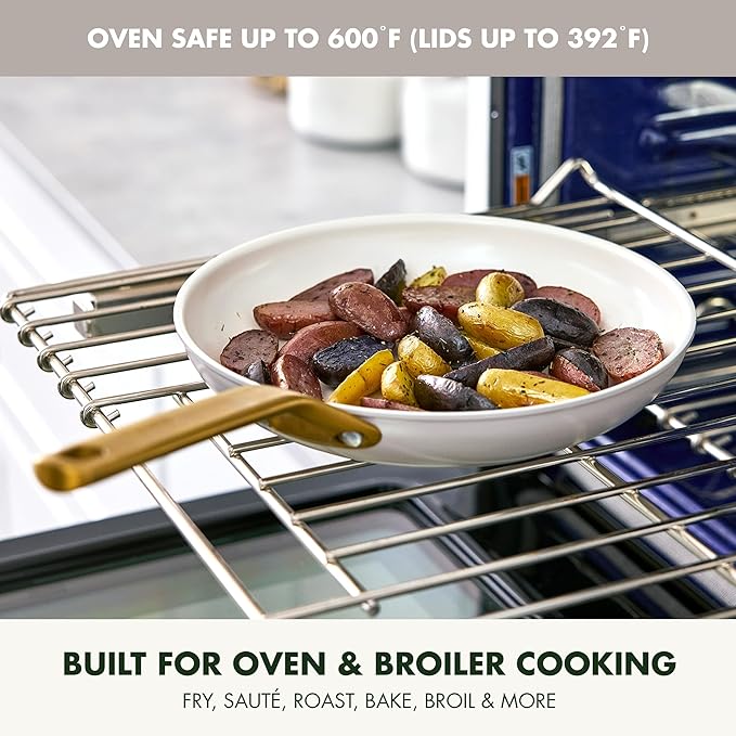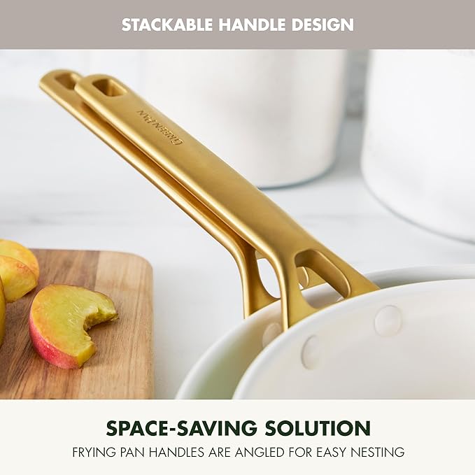 - STAINLESS STEEL GOLD-TONE HANDLES: Riveted matte-finished handles offer a safe and secure grip while adding a pop of design to any kitchen.