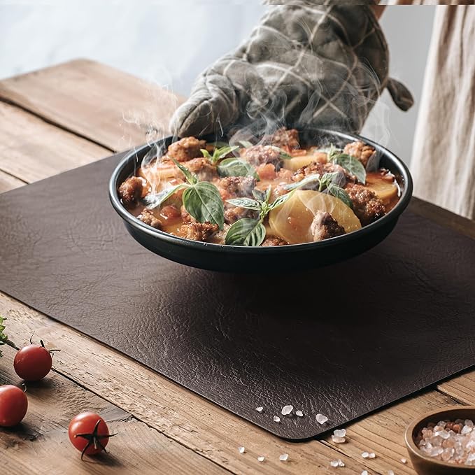 - [Reversible Dual-Color Design] Crafted from luxurious and durable faux leather, DOLOPL brown placemats feature a reversible color design that adds an elegant touch to your dining table. Switch sides to match any mood, season, or décor—one set offers two stylish looks while saving space and money. Whether for everyday meals or special occasions, these table placemats provide lasting protection and retro appeal.