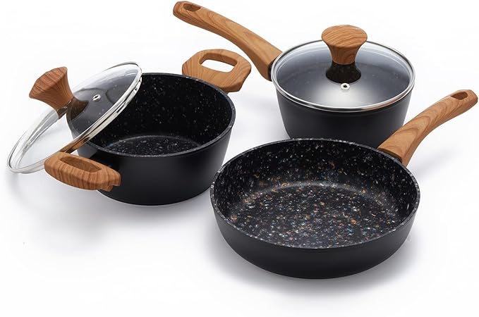 - 【Your New Kitchen Dream Team】 Meet your perfect cooking trio: the 8.5-inch frying pan for flawless eggs and pancakes, the 1.5-quart saucepan for simmering sauces, and the 2.2-quart pot for hearty soups and pasta. This set handles your daily cooking missions without cluttering your cabinets.