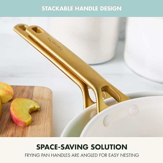 - STAINLESS STEEL GOLD-TONE HANDLES: Riveted matte-finished handles offer a safe and secure grip while adding a pop of design to any kitchen.