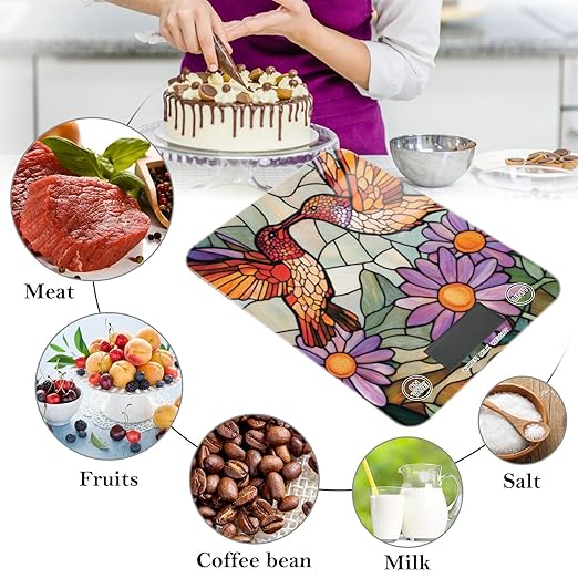 Brown Hummingbirds Purple Daisy Stained Glass Food Scale Kitchen Digital Scale Food Ounces and Grams Dieting Baking Cooking Waterproof Glass Panels LCD Display,4 Units Tare Function
