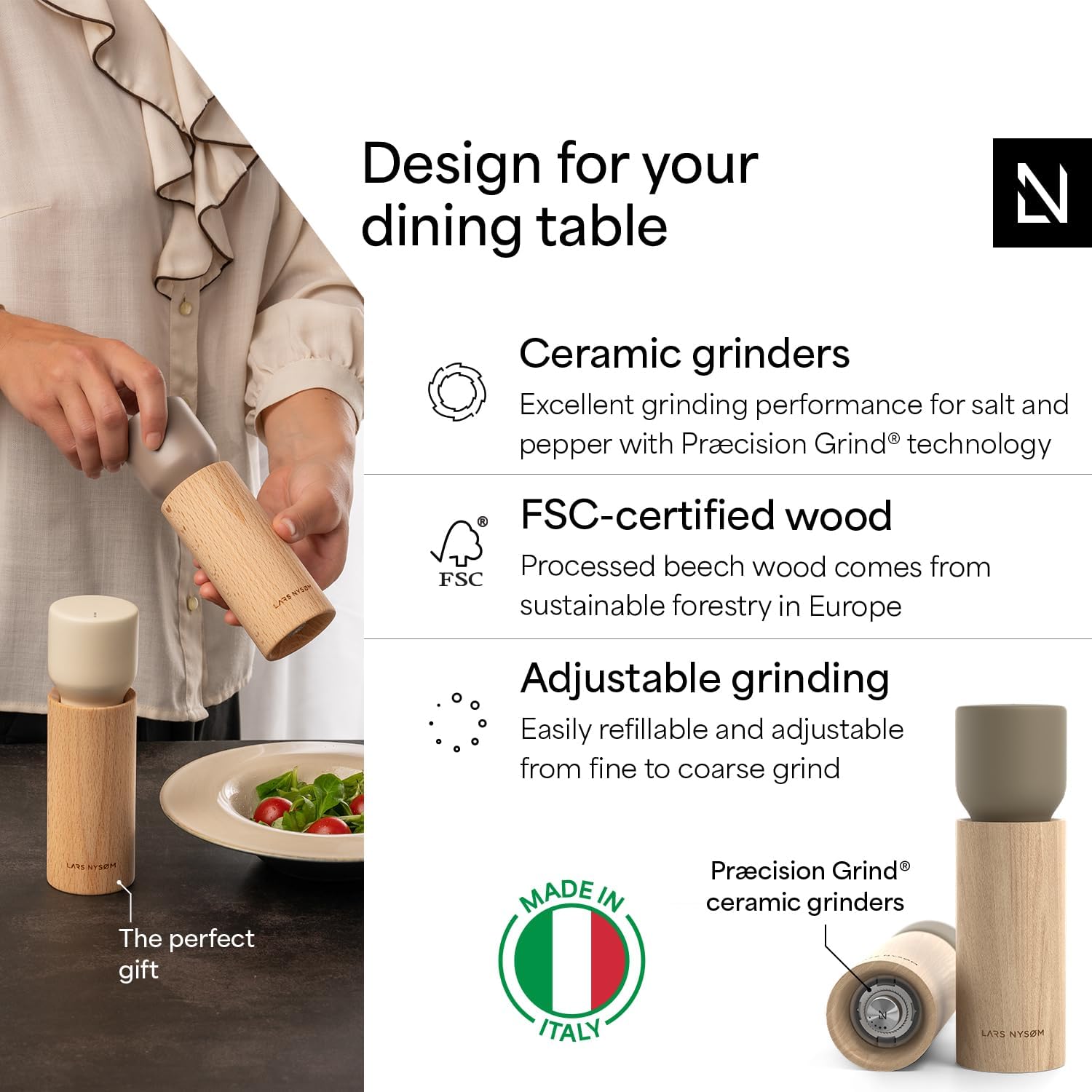 LARS NYSØM Wooden Salt and Pepper Grinder Set Manual with Tray - Salt and Pepper Mills with Adjustable Ceramic Grinder - Elegant Beechwood Pepper and Salt Mill Set for Dining Table (Taupe Brown)