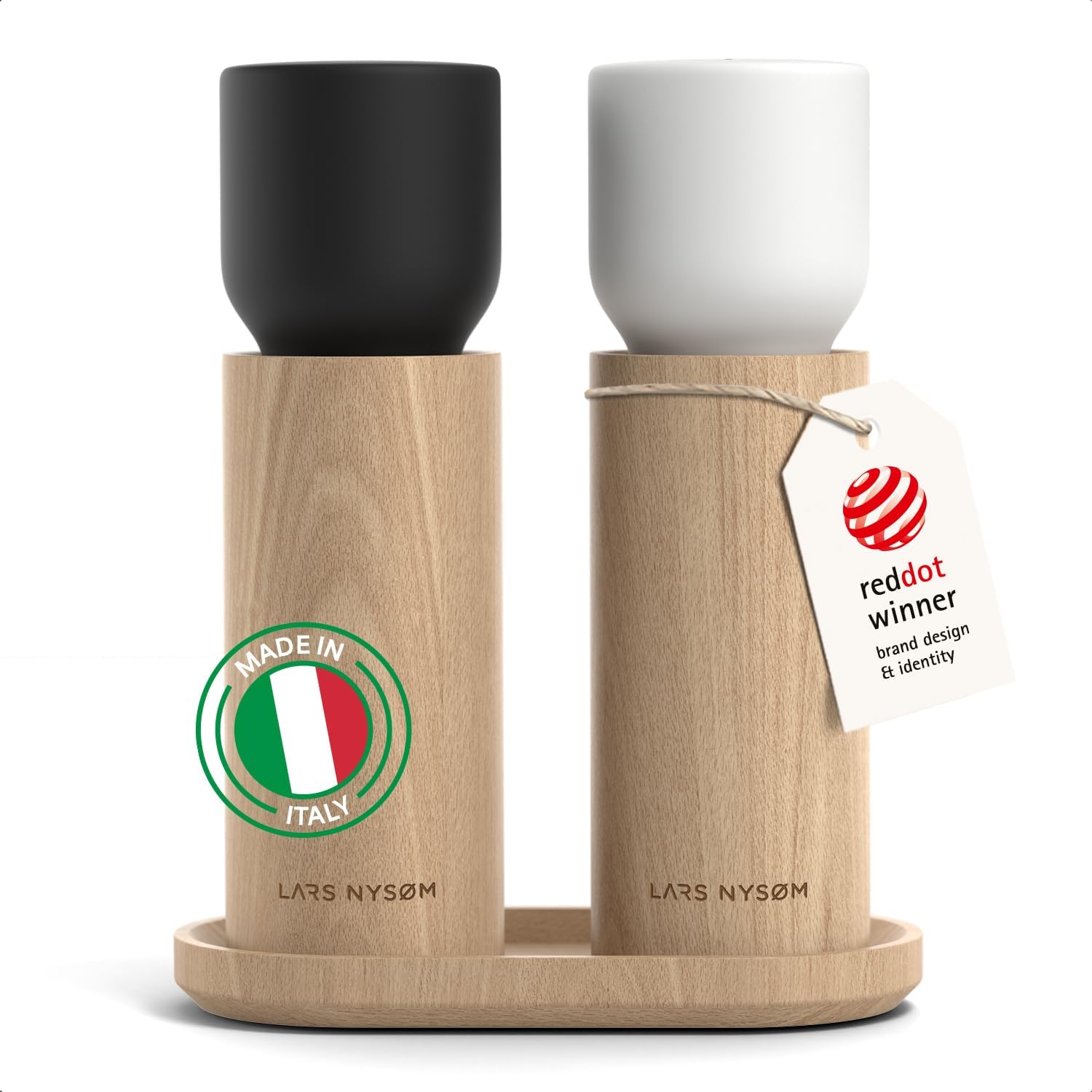 LARS NYSØM Wooden Salt and Pepper Grinder Set Manual with Tray - Salt and Pepper Mills with Adjustable Ceramic Grinder - Elegant Beechwood Pepper and Salt Mill Set for Dining Table (Black/White)