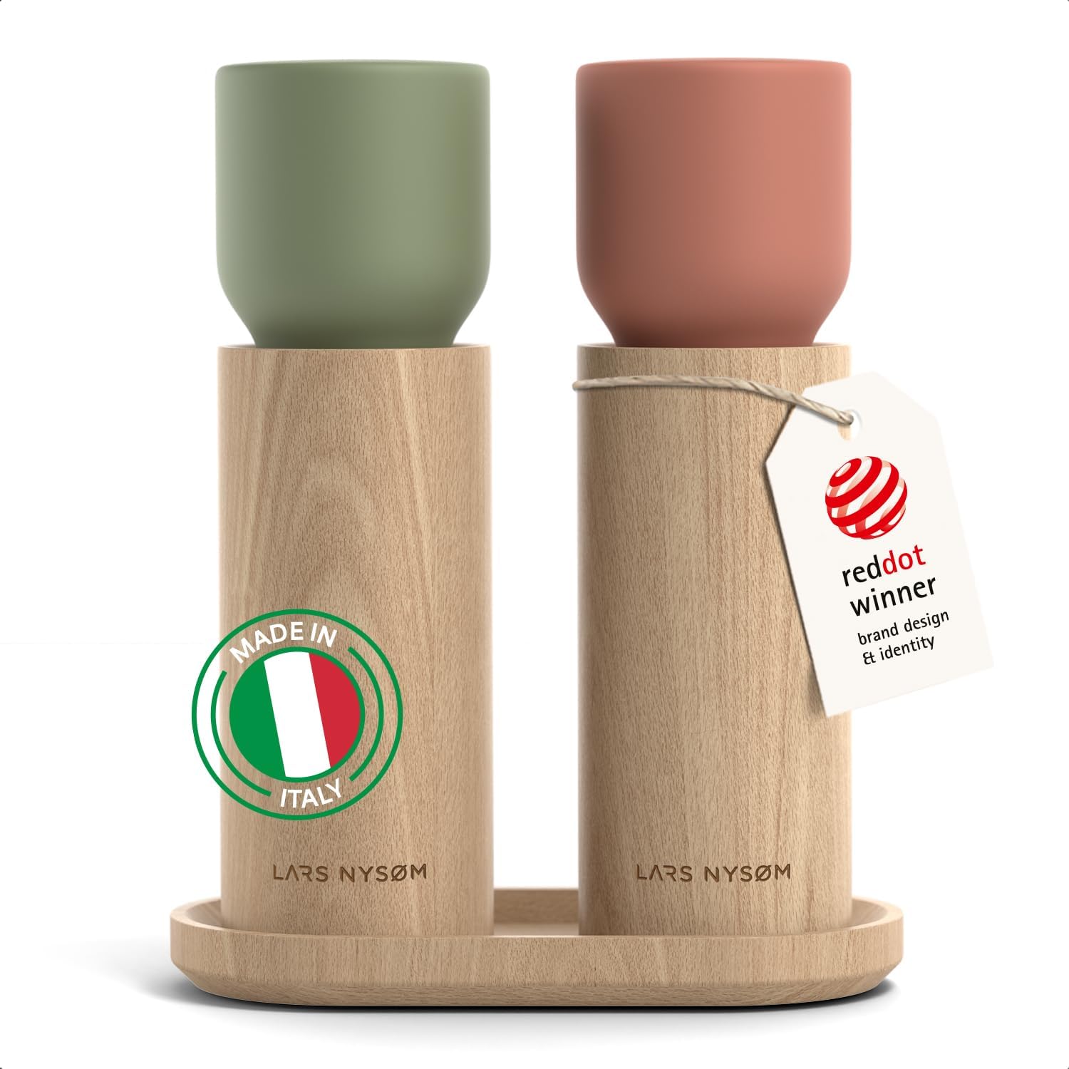 LARS NYSØM Wooden Salt and Pepper Grinder Set Manual with Tray - Salt and Pepper Mills with Adjustable Ceramic Grinder - Elegant Beechwood Pepper and Salt Mill Set for Dining Table (Red/Green)