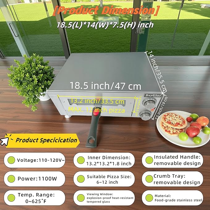 - See-through Viewing Window Design & Sturdy Material: Crafted with durable food-grade stainless steel, BeyGior electric pizza oven assures you a secure and hassle-free baking experience. Thanks to the explosion-proof heat-resistant tempered glass window, lets you keep an eye on your culinary creation as pizza maker does its magic.Coupled with the provided baking grill and crumb tray, this countertop pizza oven is able to bake crispy pizzas up to 12 inches, easily cleaned,perfect for your kitchen, dorm, and parties.