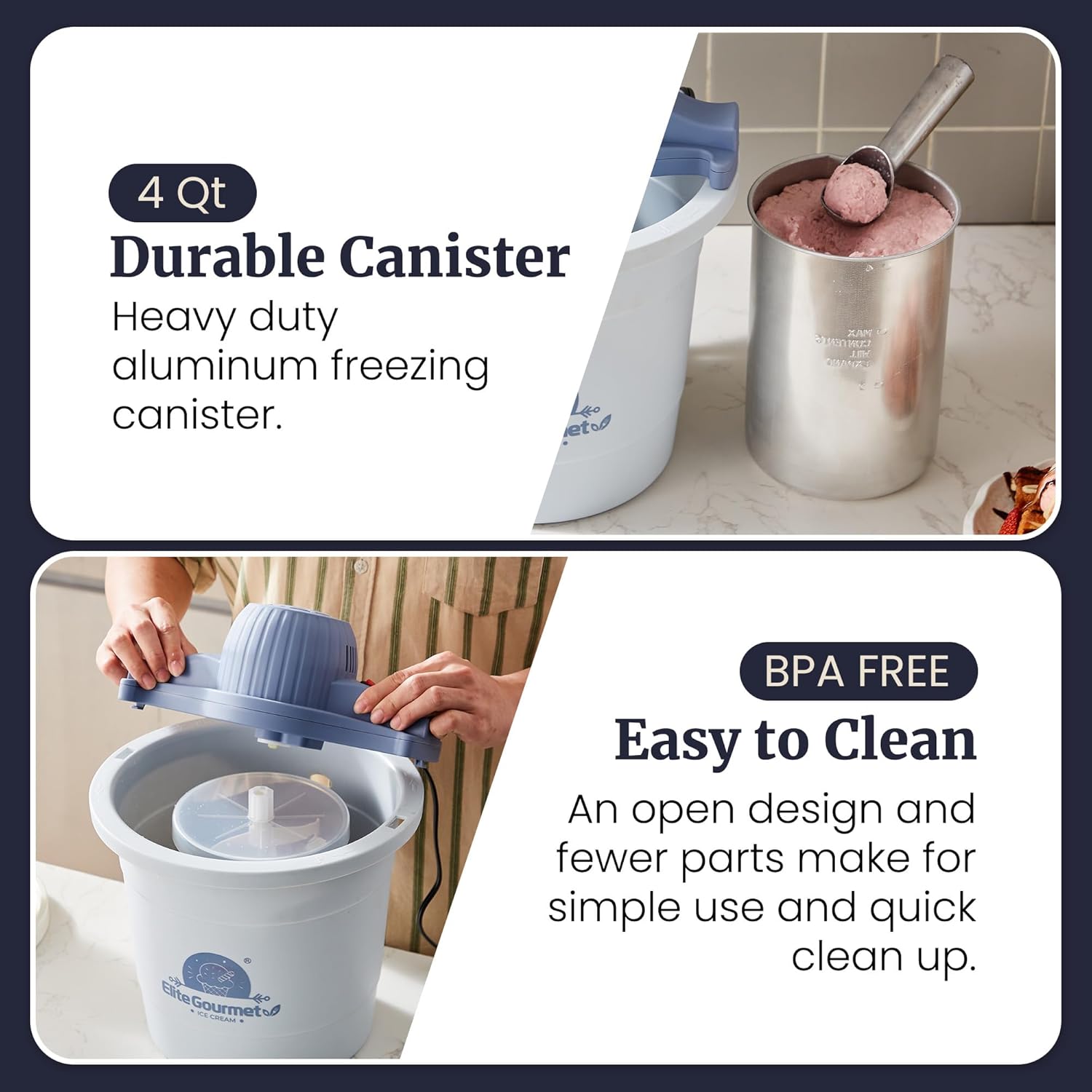 Elite Gourmet 4Qt Electric Ice Cream Maker EIM350X Delicious Homemade Ice Cream, Gelato, Sorbet, Frozen Yogurt, 4Qt Aluminum Freezing Cannister, Durable Plastic Ice Bucket, Powerful 50W, Periwinkle