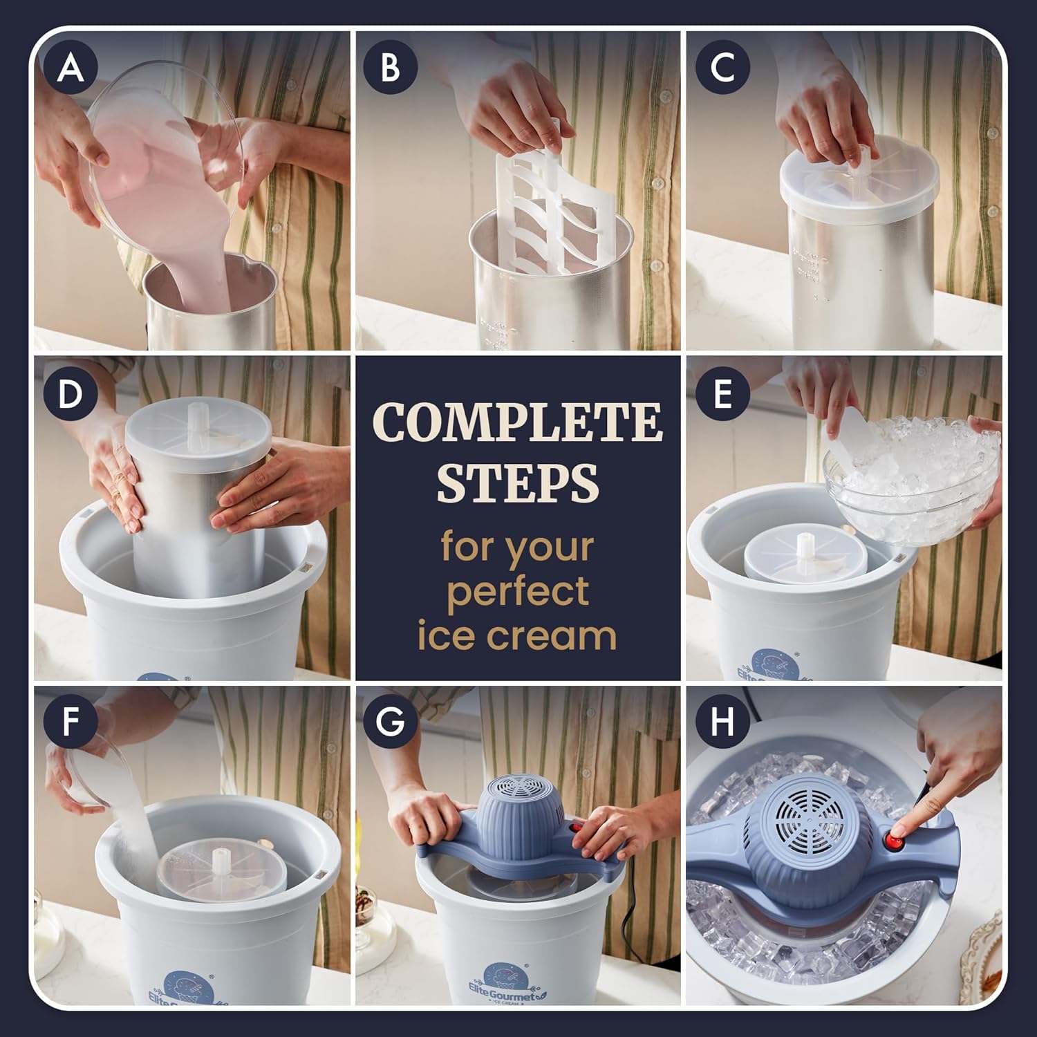 - EFFORTLESS ENJOYMENT: Using the Elite Gourmet Ice Maker is a breeze. Simply place prepared ice cream mix into the aluminum freezing cannister and place into the ice bucket, install the electric motor, then add ice & salt, plug in & turn On. Perfect, fluffy ice cream and other delicious treats will be ready to serve in no time! Add your favorite condiments and indulge in a cold, fresh & frosty treat!