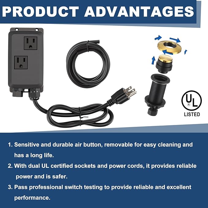- Safe and reliable: This air switch kit has been fully certified by UL (covering power cords and overall safety), is made of strength corrosion resistant materials, and has a waterproof and moisture-proof design, effectively eliminating the risk of electric shock in the kitchen environment and ensuring worry free use
