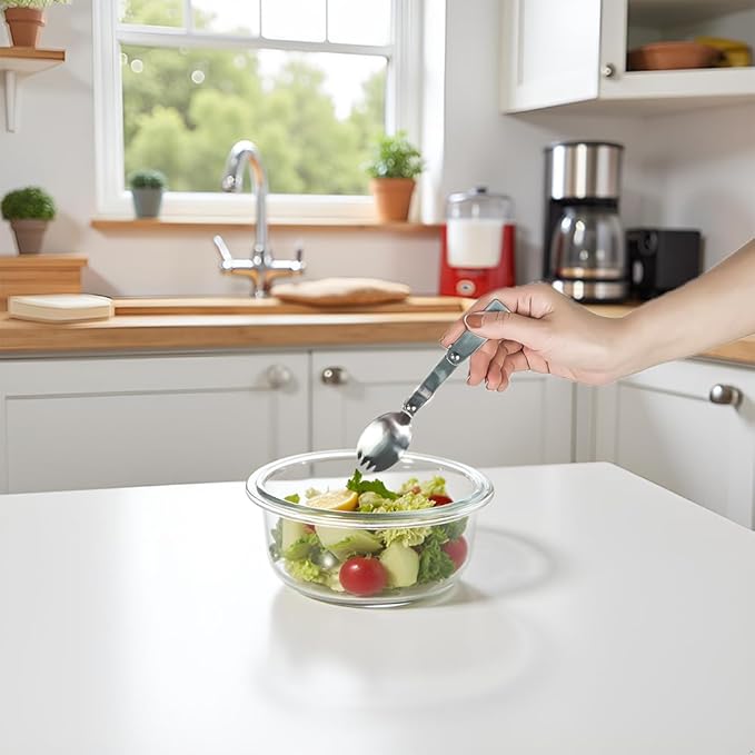 - 【Food Grade】The 12oz round glass food containers are made of high quality borosilicate glass, making it safe for food storage and glass container comes with a folding spoon, It is suitable for storing fruits, salads, cereals, meals, soups. very suitable for taking school, work, and outdoor activities