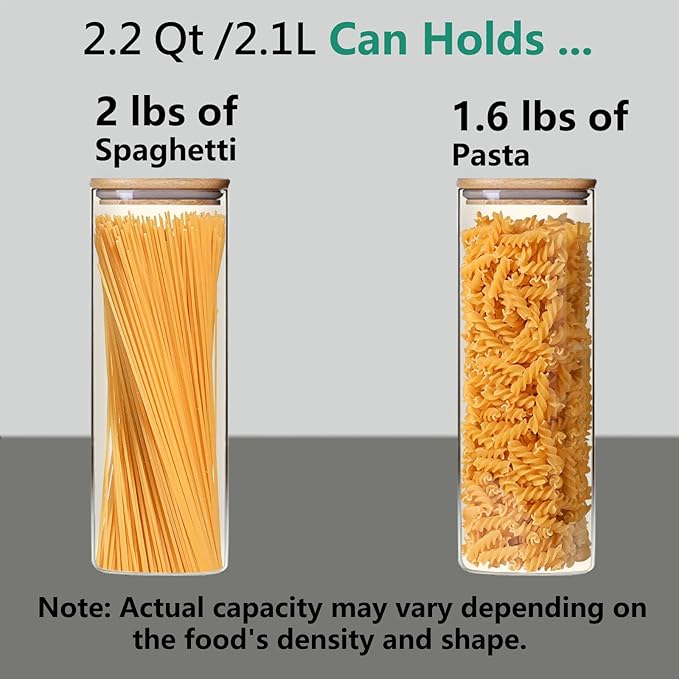 - [Tall and Large for Food Storage] 3 Square jars with , dimensions are 3.94x11.26 inches(10cmx28.6cm),It can store pasta, noodles, flour, cereal, tea,cookies, candy, flour, rice, beans, spice, cereals etc.Store goodies for foodies and keep your kitchen organized