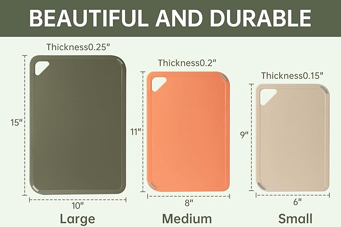 - NEW COLOR MATCHING: THETCHRY plastic cutting board set of 3, with a brand new color matching, the small size is elegant white, the medium size is bright orange and red, and the large size is deep and steady green. The 3-piece set has a new color matching, adding a touch of bright color to your kitchen.