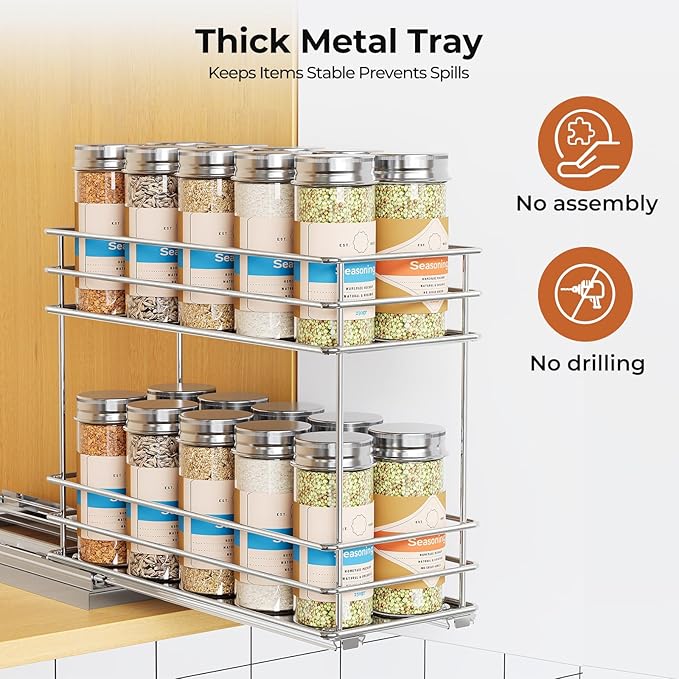 Pull Out Spice Rack Organizer for Cabinet, Slide Out Spice Racks, Easy to Install, 4.0''Wx10.35''Dx8.26''H, 1 Drawer 2 Tiers(Silver)