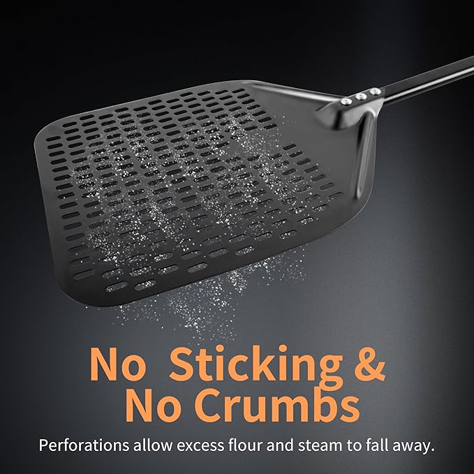 - Perforated Non-Stick Surface & No Mess: Crafted with premium aluminum oxide, our 12 pizza peel features a unique perforated design for better airflow. It prevents sticking and ensures crumbs fall away, making it effortless to handle pizza dough, bread, or calzones for a perfect transfer every time.