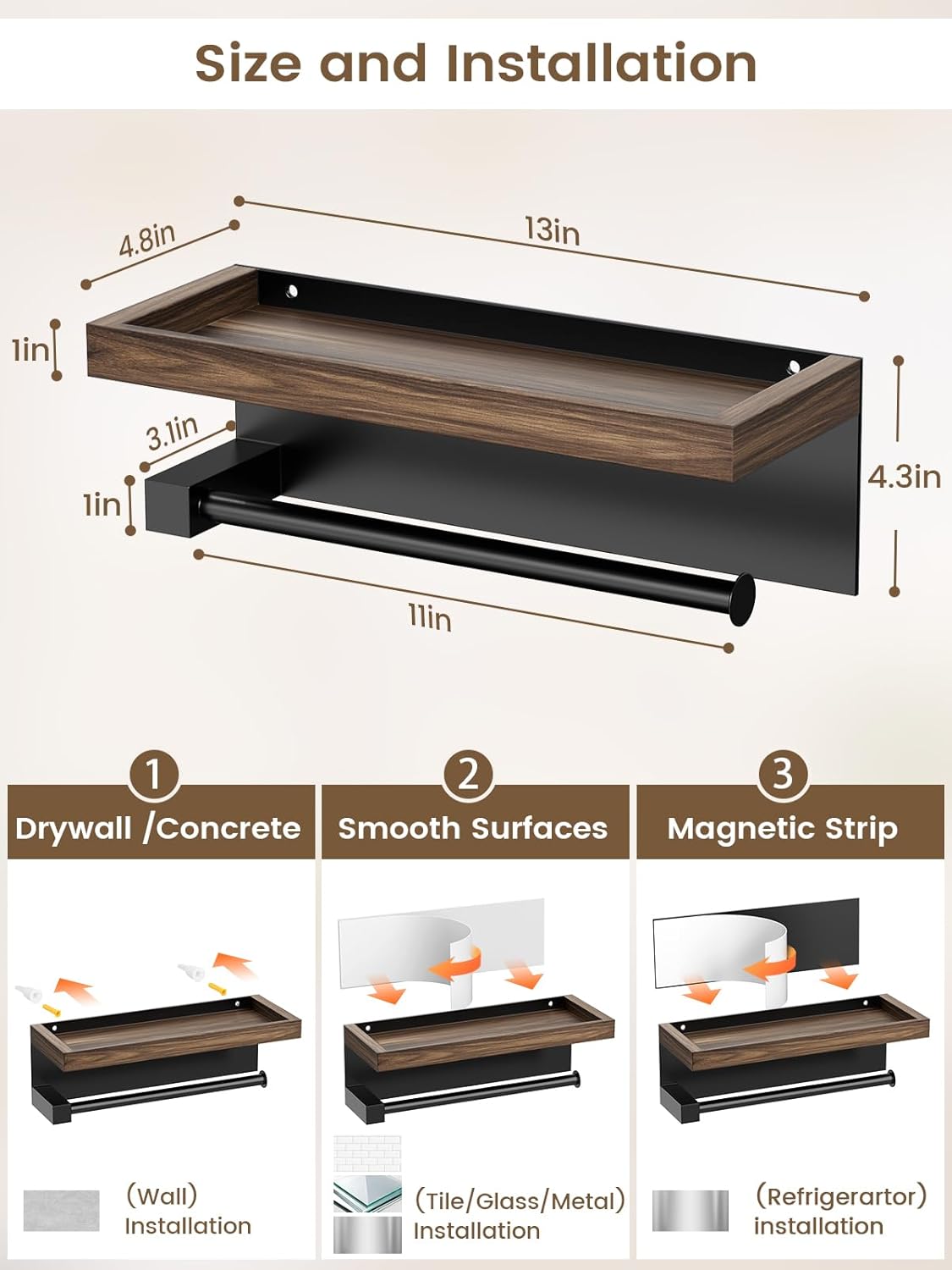 - Practical & Stylish: Crafted with a sturdy metal frame and solid wood shelf, this matte paper towel holder provides extra storage for spices, decor, or essentials while adding modern and farmhouse charm to your kitchen, bathroom, or RVs camper decor.