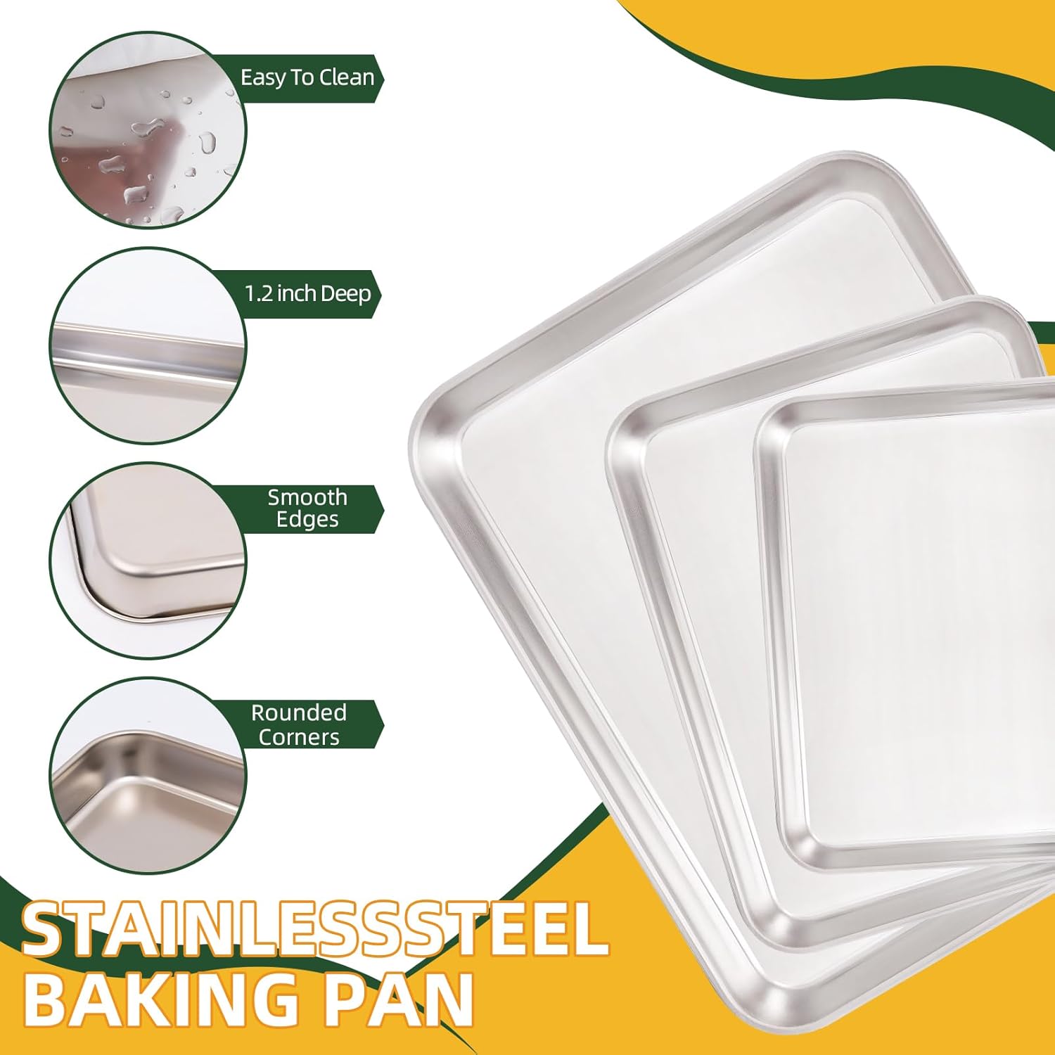 - HEALTHY & NONTOXIC STAINLESS STEEL: Our baking pan set made of food-grade pure 18/0 stainless steel without without chemical coating or any other materials, Good heat and corrosion resistance, Safe enough to baking all kinds of dishes and without leaching anything harmful, Healthier alternative to aluminum pans for everyday baking use. Compared with glass or ceramic sheet pan, it is unbreakable. Compared with aluminum, it is more healthy. ALSO, more environmentally friendly than disposable baking pans.