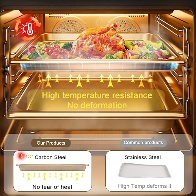 - Heavy-Duty Carbon Steel β Crafted from premium carbon steel thatβs 57% thicker than standard pans. Reinforced encapsulated rims prevent warping and ensure long-lasting durability for baking, broiling, grilling, and roasting.