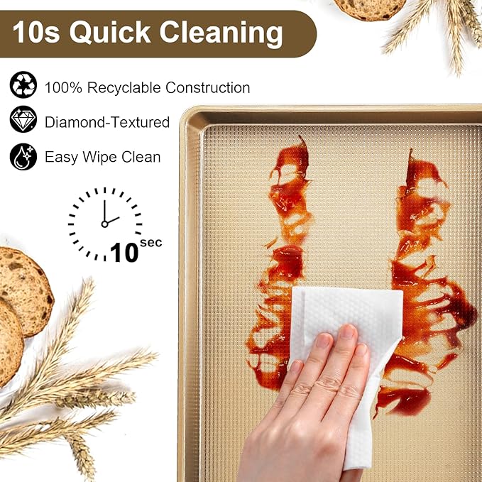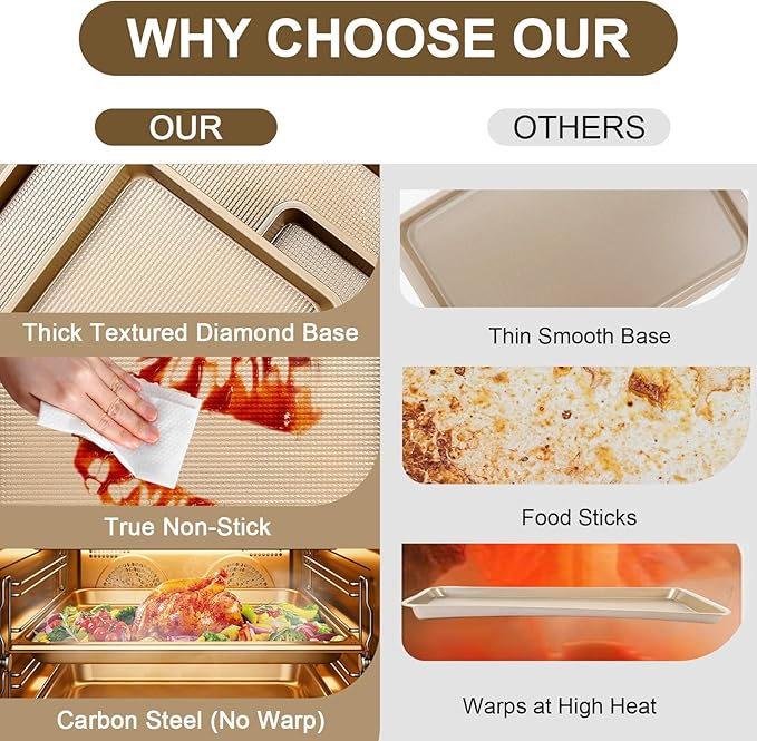 - Nonstick Diamond Texture β Each baking sheet features a unique diamond & square pattern that enhances nonstick performance and promotes even heat distribution. Enjoy perfectly baked cookies, pastries, and sheet-pan dinners without burnt or soggy spots.