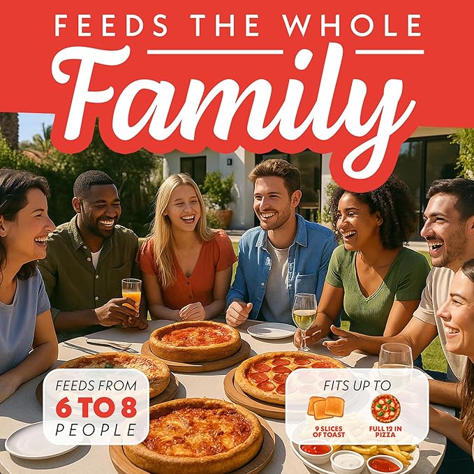 - Versatile Cooking Options – Six dedicated pizza presets (Neapolitan, New York, thin crust, pan, frozen, and manual) plus seven functions including air fry, bake, roast, broil, toast, bagel, and dehydrate cover everyday meals and snacks