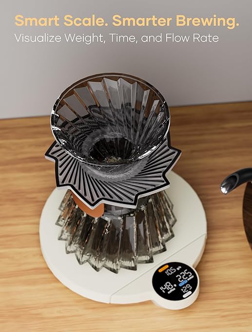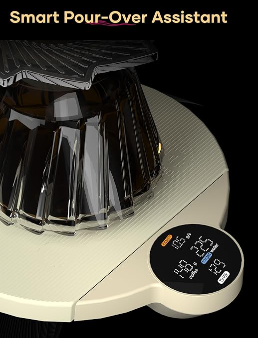 - Built-in Timer & Real-Time Accuracy – Integrated digital timer helps you control blooming and pouring time precisely. The responsive sensor delivers instant weight feedback, ensuring perfect extraction and balanced flavor in every cup.