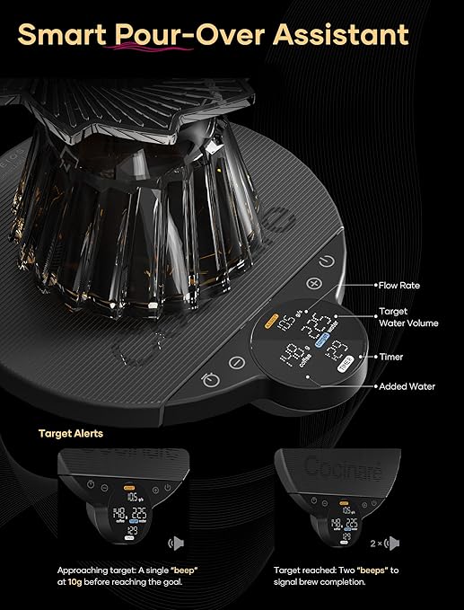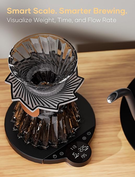 - Built-in Timer & Real-Time Accuracy – Integrated digital timer helps you control blooming and pouring time precisely. The responsive sensor delivers instant weight feedback, ensuring perfect extraction and balanced flavor in every cup.