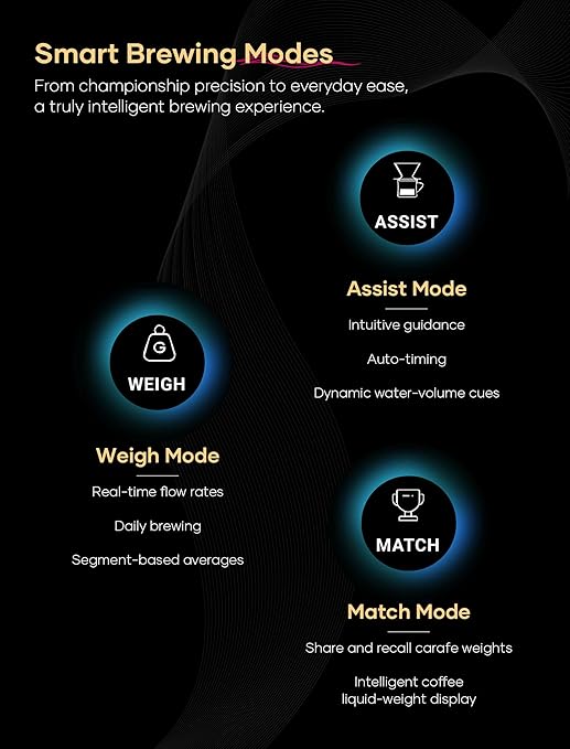 - 3 Intelligent Brewing Modes – Master your pour-over technique with three dedicated modes: Brewing Assist, Weighing, and Competition. Whether you’re a beginner or a barista, these modes guide you through flow rate, timing, and ratio to elevate your coffee brewing skills.