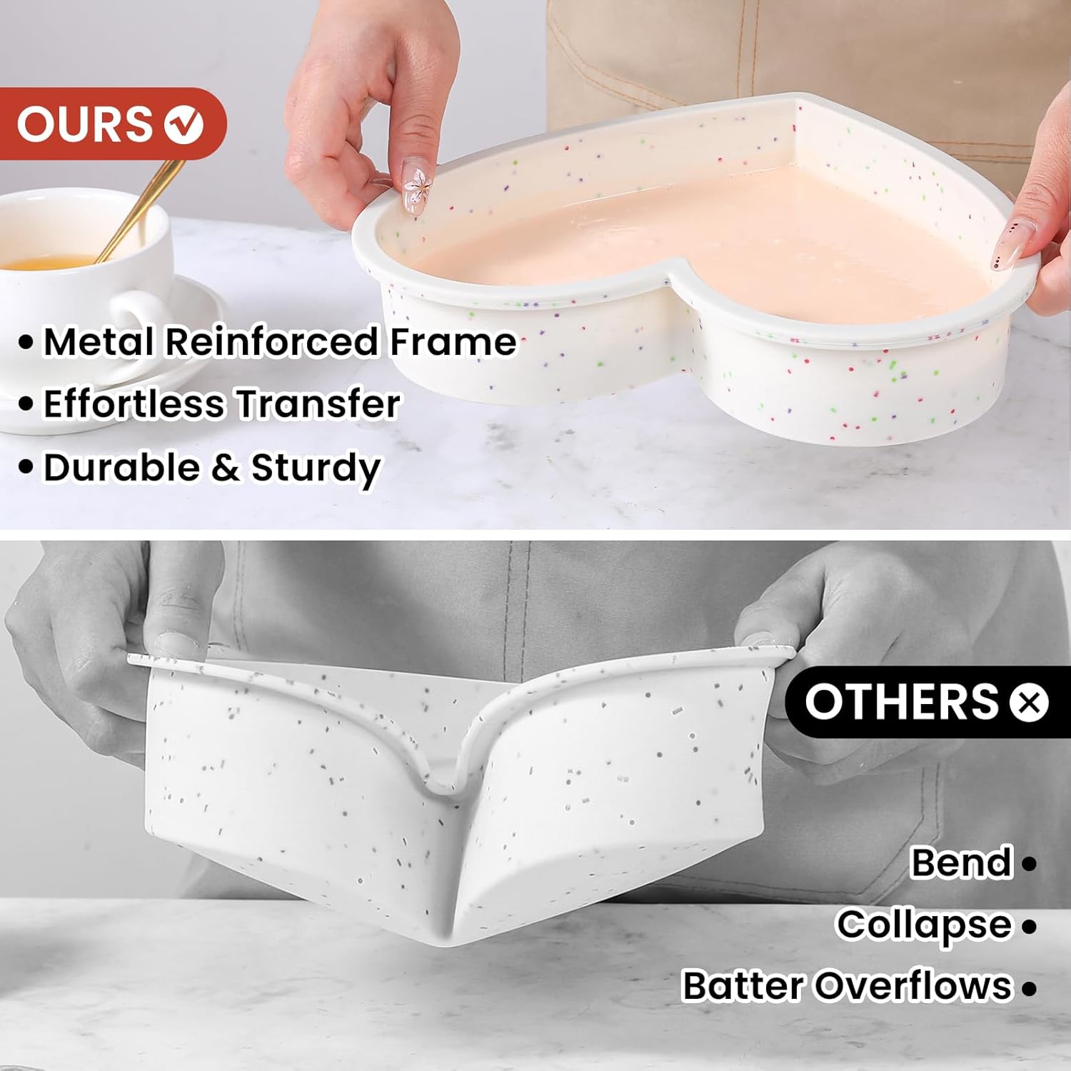 - Stainless Steel Frame Design: Our heart shaped cake pans features sturdy stainless steel frame that removes the need for a baking tray for support. You won’t have to worry about batter spilling—this frame keeps the mold stable and easy to move