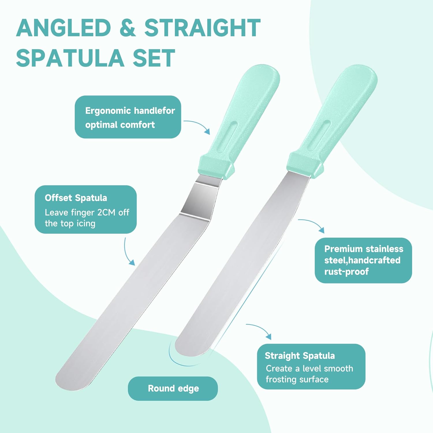 • Straight and Angled Frosting Spatulas: These high-quality stainless steel frosting spatulas make it easy to even out frosting and work on layered cakes. With a 12.5-inch angled spatula and a 10.6-inch straight spatula, you can create even crumb layers and perfect surfaces.3 Edges of Cake Scrapers: This cake decorating set includes 3 different icing comb scrapers, so you can make various designs on your cake. With one rounded scraper, one straight scraper, and one toothed scraper.