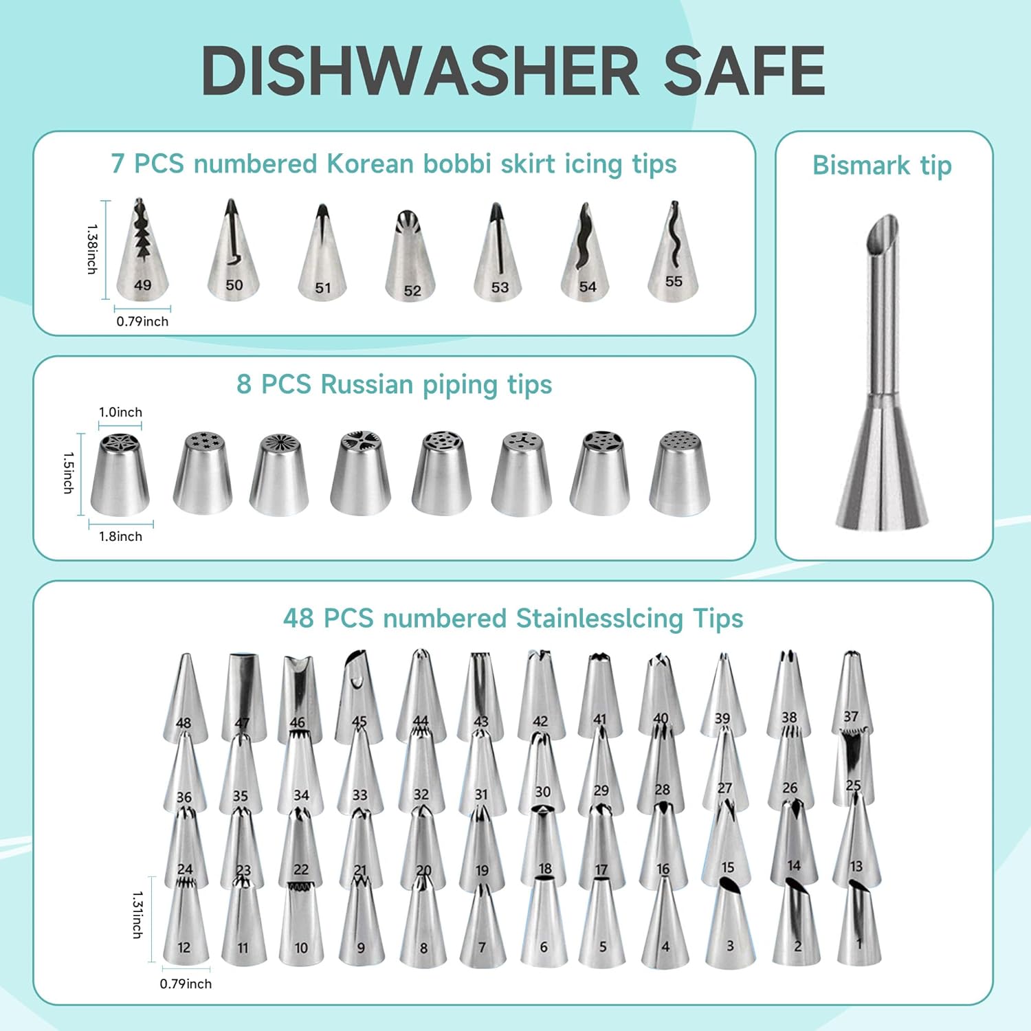 • Piping Bags and Tips Set: Includes 64 numbered icing piping tips, 30 disposable & 2 reusable 12” frosting pasty bags. Allow you to create a variety of designs, including simple dots and lines as well as intricate flowers and leaves. The included coupler makes changing tips on your piping bags a breeze without emptying the bag or creating any mess.