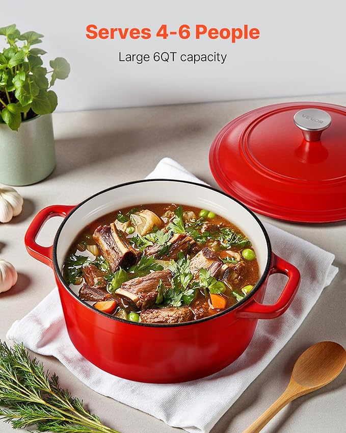 VEVOR Enameled Cast Iron Dutch Oven, 6 Quart Pot with Lid and Dual Handles, Heavy-Duty Durable Cookware Pan, Oven Induction Compatible up to 500℉, for Braising, Stews, Roasting, Bread Baking, Red